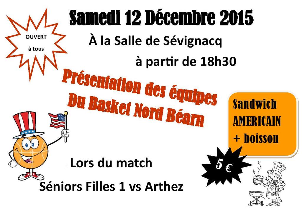 Le 12 décembre à la salle de Sévignacq à partir de 18h30, le club de Basket Nord Béarn vous présentera toutes ses équipes jeunes et seniors de la saison 2015-2016 lors du match des Séniors Filles contre Arthez de Béarn.