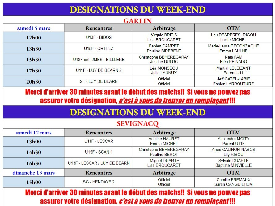 Voici les désignations pour les deux prochains week-ends !!